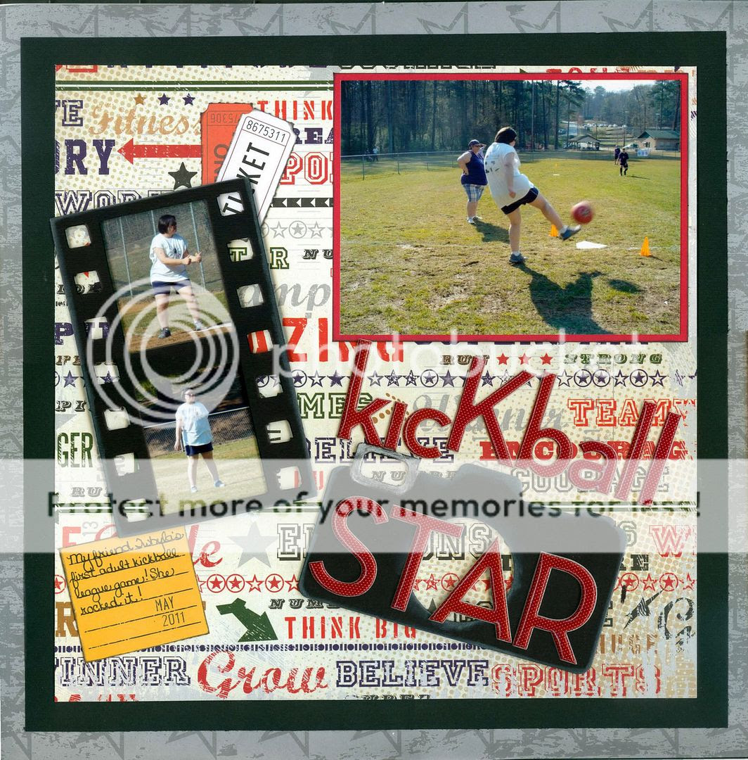 Today, my latest layout is featured over at the Basically Bare blog. This layout is all about my awesome friend Twhyla. She is the sports gal in my life. She is all about Braves baseball and Colts football, and she's not afraid to get out there and play a sport herself. Here she is playing on a kickball league!